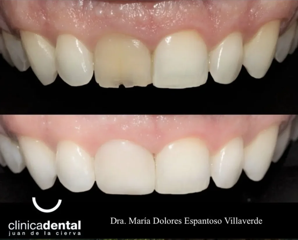 En este caso el paciente tenía un incisivo central oscurecido y astillado, Se le hicieron 2 sesiones de blanqueamiento externo para conseguir un color más claro y se le hizo una carilla de composite en el incisivo central oscurecido (1 sóla carilla)